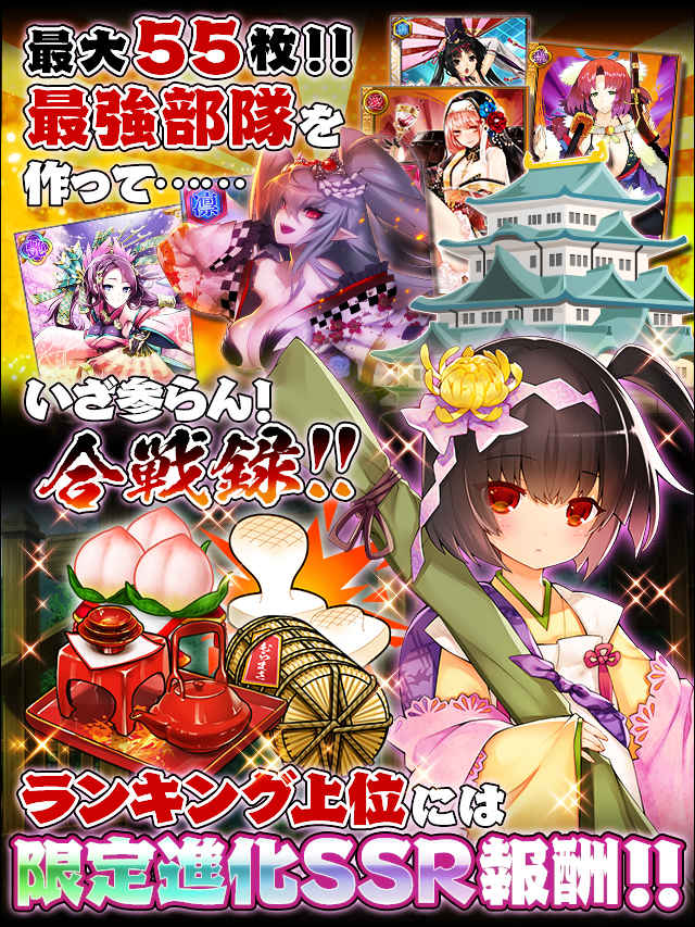 ・部隊編成 1部隊5枚で編成。 陣形によって部隊の能力が変化! 攻撃力やHPにボーナスがついたり、行動が変化するぞ! 本陣:最後の砦、味方部隊を強化! [陣形技]なし 魚鱗の陣:攻撃重視、力で押し倒せ! [陣形技]突撃(攻撃力1.5倍)/猛突撃(攻撃力2倍)/連続突撃(攻撃力3倍)/連続猛突撃(攻撃力4倍) 部隊ボーナス:HP+100(1人毎),攻撃力+500(1人毎) 長蛇の陣:守備重視、守りはまかせろ! [陣形技]包囲(対魚鱗:攻撃力2倍、その他:1.2倍)/連続包囲(対魚鱗:攻撃力4倍、その他:2倍)/兵糧確保(味方部隊のHPを回復) 部隊ボーナス:HP+200(1人毎) 車掛の陣:バランス重視、総合力で勝負! [陣形技]追撃(対長蛇:攻撃力2倍、その他:1.2倍)/連続追撃(対長蛇:攻撃力4倍、その他:2倍) 援護(味方部隊の次の攻撃力が2倍)/連続援護(味方部隊の次の攻撃力が6倍) 部隊ボーナス:攻撃力+800(1人毎) 囮兵の陣:直接攻撃なし、特殊攻撃! [陣形技]偵察(何もしない)/陽動(相手部隊のHPを半減)/毒矢(相手部隊を1撃で倒す)/煙幕(相手部隊の次の攻撃を無効化) 部隊ボーナス:なし 囮以外共通技:連続攻撃(攻撃力2倍)