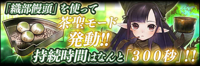 ライバルたちと差をつけたい……そんなお主のために、「織部饅頭」を用意したぞ 織部饅頭を使うといきなり茶聖モードが発動し、しかも効果時間は通常90秒のところ、「300秒」となるのじゃ 更に行動兵力が100回復し、攻撃兵力と防御兵力は全回復する、禁断のアイテムなのじゃ 織部饅頭は「ガチャ」や、様々な報酬でGETできるぞ! 織部饅頭を使って、ランキング上位を目指すのじゃ!!