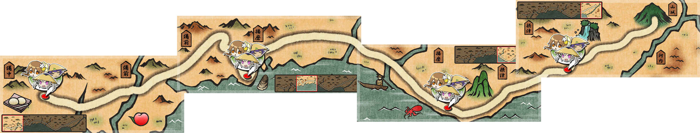 | - | 高松城→辛川宿 | 1週目 | 「出発じゃな!!さぁ、山崎へといそぐのじゃっ!!」 秀吉「うぅん……ちょっと夢見てた感じがして……どんな夢だったかなぁ……」 | 1里31丁 | |
