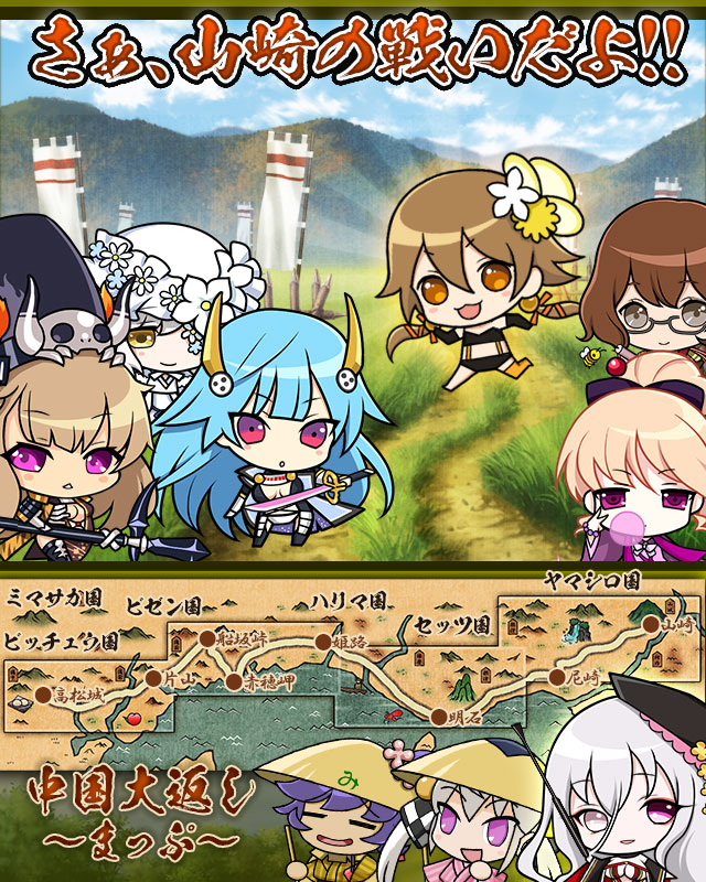 | 官兵衛「毛利へは停戦を取り付けましたが……背後の気配りぬかりなく」 秀吉「それより、歩くの遅い人へはちゃんと手助けするように指示出しておいてね」 | |