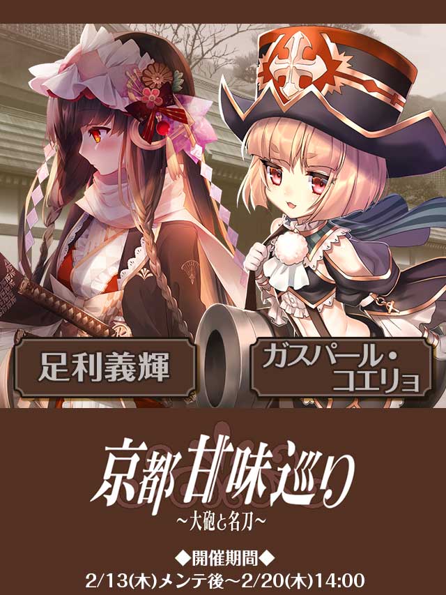 ガチャに登場する「[異教謁見]足利義輝-京都甘味巡-」&「[布教特権]ガスパール・コエリョ-京都甘味巡-」に、イベント報酬の装具をセットすると絵柄が変化!