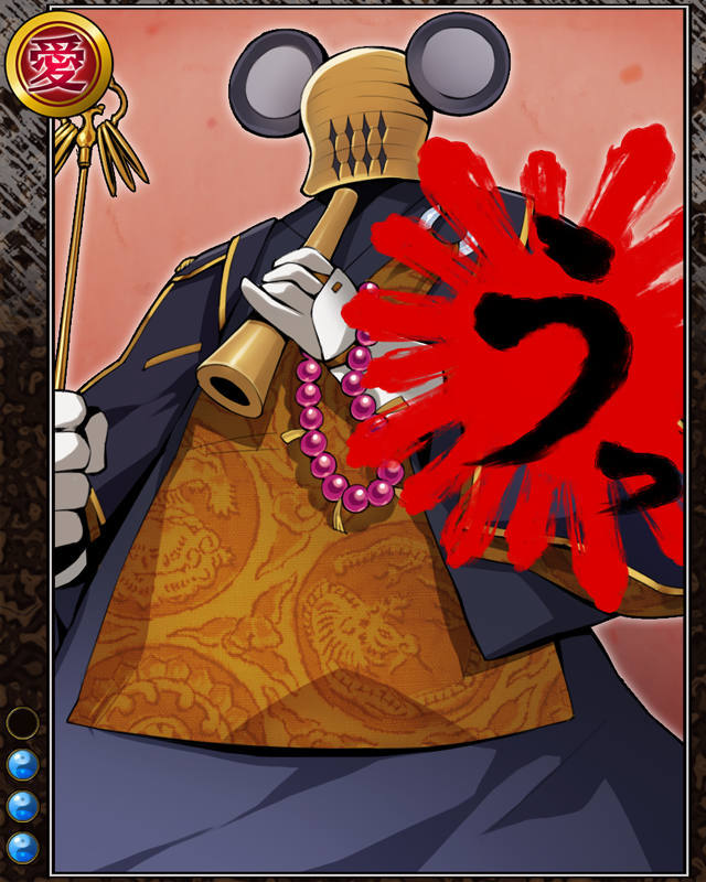 | コメント | 蒼「真面目にやって」紅「やってるもん!!」橙「喧嘩はメっ!!」 石川本願寺の虚無僧。 尺八の音色は寝た子も泣きだすほど酷いと不評。 夜中に巨体が弾け飛んだと噂になった | |||