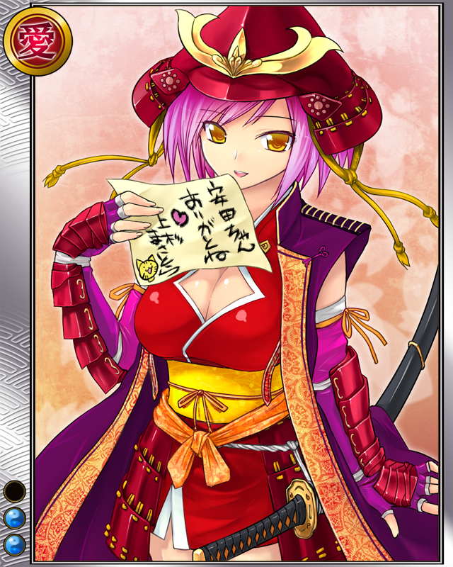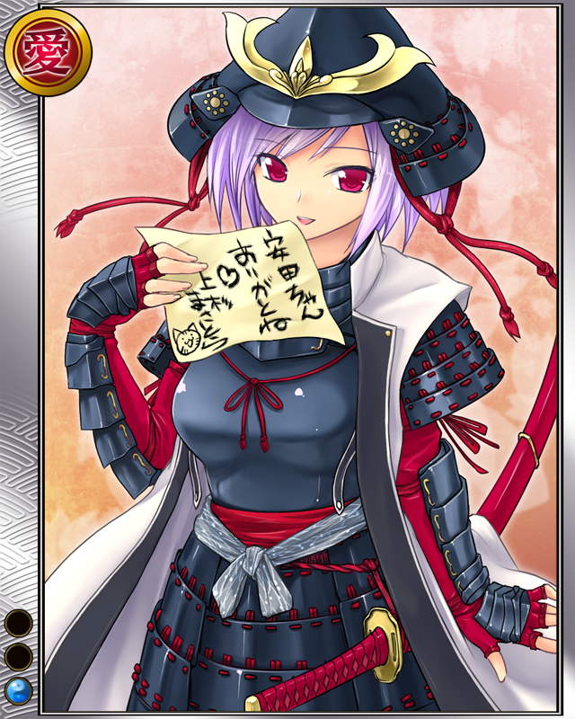 | コメント | 「えへへ……これ景虎ちゃんに貰っちゃった」 上杉家家臣で安田城城主。 川中島の戦いでは上杉謙信の側近として奮戦、 後に血染めの感状を賜った。 | |||