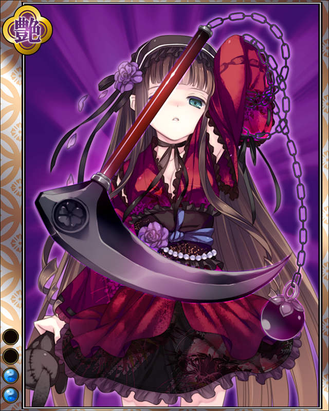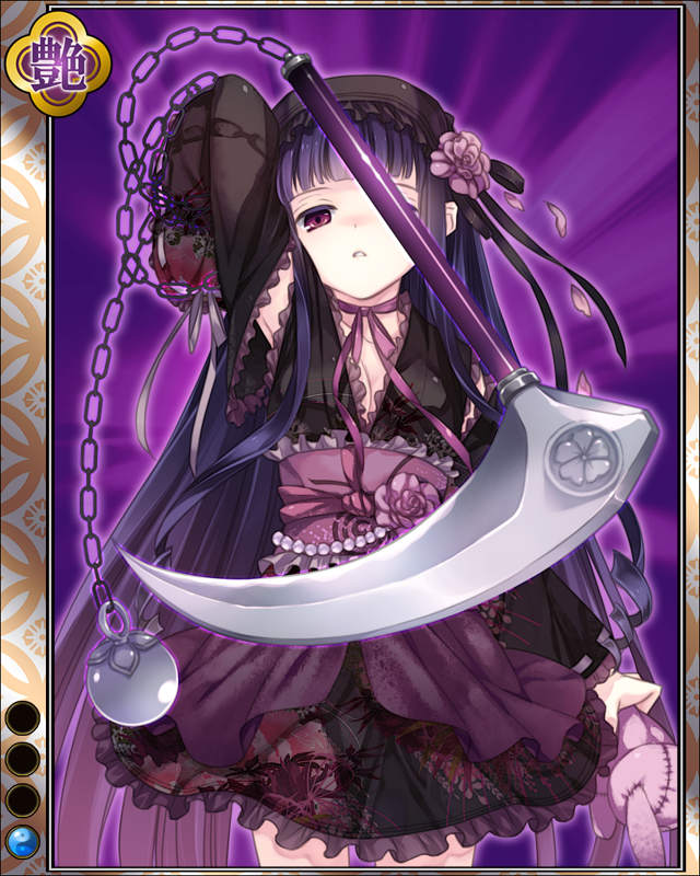 | コメント | 「ふふ、夜の帳より来るは私……」 宮本武蔵の二天記に名を残すイガ国出身の武芸者。 変幻自在に鎖鎌を操り、武者修行中の武蔵に迫るも打ち倒された。 | |||