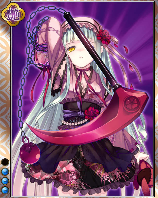 | コメント | 「踊りましょう、私の刃と……」 宮本武蔵の二天記に名を残すイガ国出身の武芸者。 変幻自在に鎖鎌を操り、武者修行中の武蔵に迫るも打ち倒された。 | |||