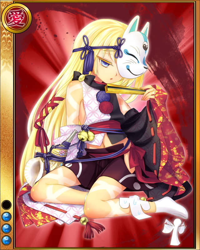 | コメント | 「えいえいおー……」 島津義久の軍配者として島津の重要な戦の末を占う。 その幽玄なる声は兵の指揮を高め、高らかなる勝鬨は勝利の思いをより高めた。 |