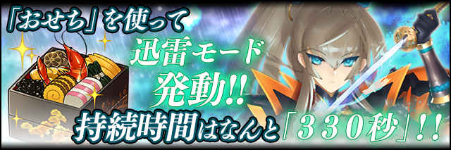 「年末年始大暴れ!!」で発動する迅雷モードは通常発動で100秒、イベントアイテム「おせち」を使っての発動で330秒と少し時間が延長されたぞ!!
