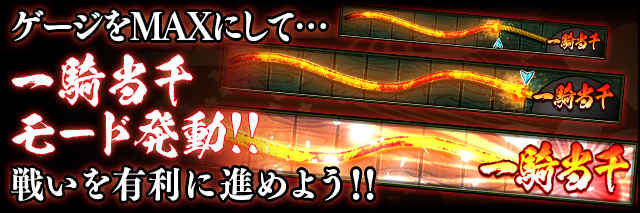 バトルを挑むと「一騎当千ゲージ」がたまっていくぞ!! ゲージをいっぱいにためると、獲得戦功Pが2倍になる一騎当千モードが発動するぞ!!さらに攻撃力が上がるおまけ付きじゃ!! 180秒の限られた時間で一気に敵を倒すのじゃ!! イベント専用アイテムと組み合わせると一気に大量ポイントを獲得できるぞ!!