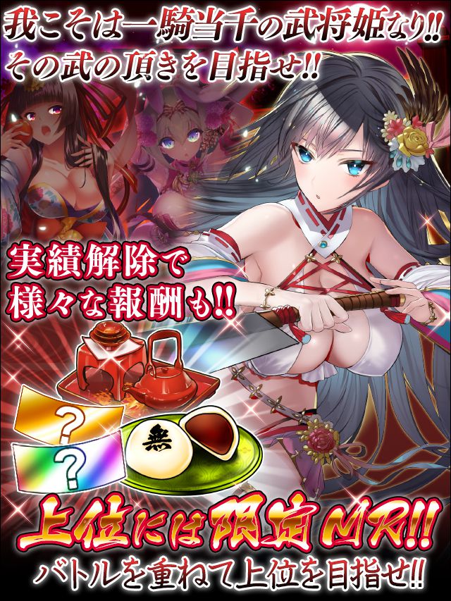 | 26 | 一騎当千 | バトルを合計1000回行った | イベントガチャチケット(SR以上確定) | 57 | ついに御大将 | 階級が-御大将-になる | 無双まんじゅう |