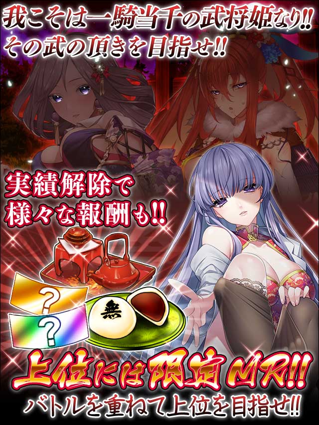 | 26 | 一騎当千 | バトルを合計1000回行った | イベントガチャチケット(SR以上確定) | 57 | ついに御大将 | 階級が-御大将-になる | 無双まんじゅう |