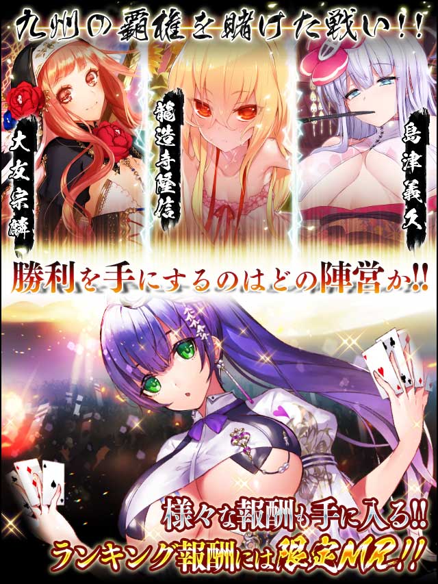 宗麟「九州の覇権を賭けた勝負ですね……負けられません」 信長「賭け事か……ほどほどに頑張るか……」 秀吉「柱を一本賭けてドン!!」 咲姫「久々のこの三人、勝負から目が離せないのう!!」