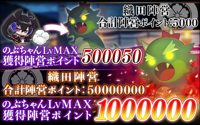 | レベル | 投資P | ![]() 織田陣営【のぶちゃん】 | ![]() 豊臣陣営【ひでよし】 | ![]() 徳川陣営【ただかつ】 | 獲得陣営P |