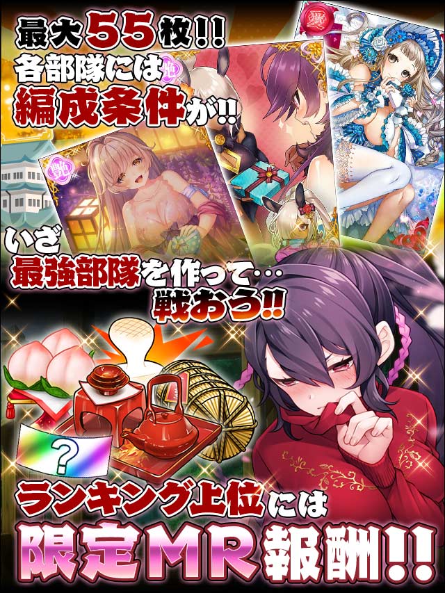 部隊の編成にガチャ追加カード(URR)をセットすると、その部隊の戦功P、勝ち点が100%ずつ加算される!! 部隊の編成にガチャ追加カード(MR)をセットすると、その部隊の戦功P、勝ち点が50%ずつ加算される!!