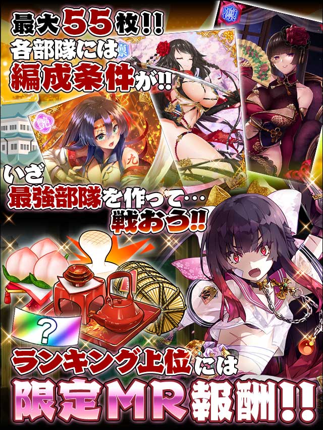 部隊の編成にガチャ追加カード(URR)をセットすると、その部隊の戦功P、勝ち点が100%ずつ加算される!! 部隊の編成にガチャ追加カード(MR)をセットすると、その部隊の戦功P、勝ち点が50%ずつ加算される!!