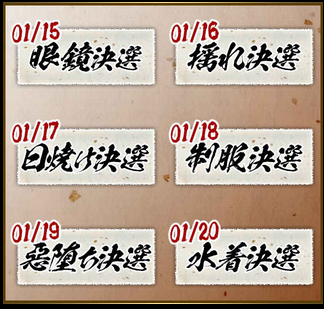 投票が終了すると決選ごとに勝者が決まり、装具での絵柄変化が約束されるぞ!! 眼鏡決選で勝利すれば眼鏡をかけた絵柄に、水着決選で勝利すれば水着姿へと絵柄変化するのじゃ!! 勝利した武将は後日装具による絵柄変化が行われるから楽しみに待つとよいぞ!!