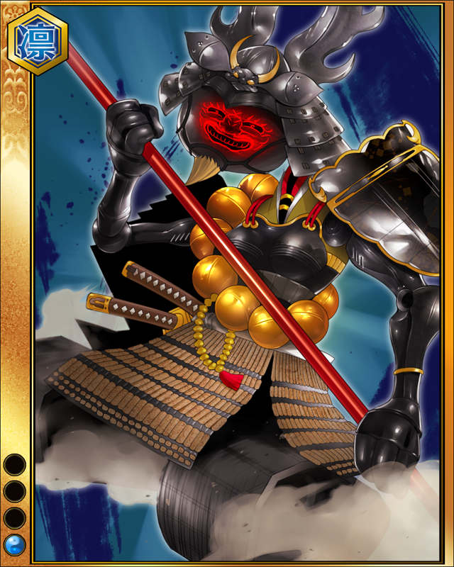 | コメント | 「000101……ALL*CLEAR……」 槍/蜻蛉切:敵を両断する藤原正真作銘の大身槍。 鎧/当世具足:機動力を高める為、軽装備。 兜/鹿角脇立兜:軽量かつ堅牢。 馬/三国黒:荒地走破性能有り |