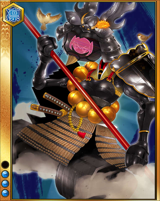 | コメント | 「YES*マスターイエヤス、命令してください」 槍/蜻蛉切:敵を両断する藤原正真作銘の大身槍。 鎧/当世具足:機動力を高める為、軽装備。 兜/鹿角脇立兜:軽量かつ堅牢。 馬/三国黒:荒地走破性能有り |