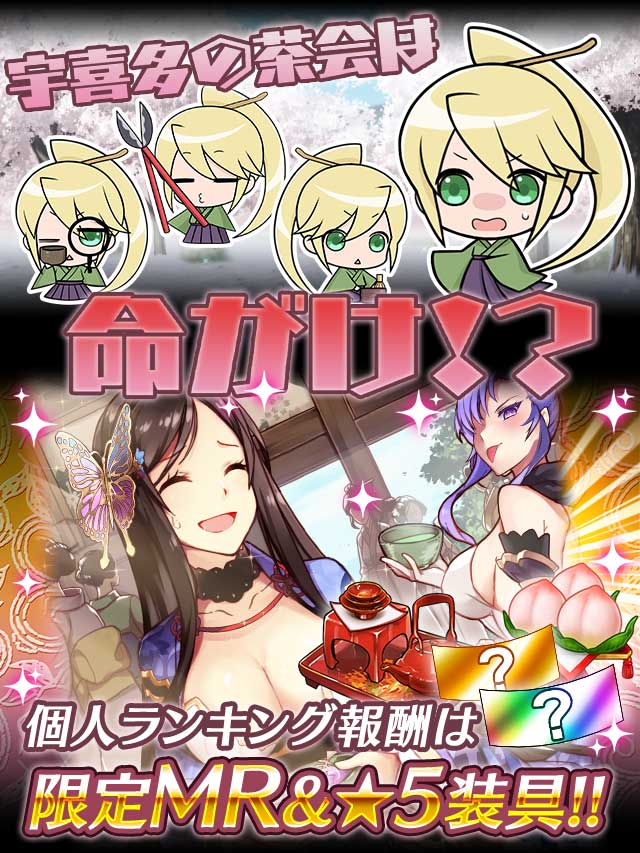 茶人ランク:変化の巻物 茶数寄ランク:金の小槌ガチャチケット×2 御茶頭ランク:金の小槌ガチャチケット×5 茶頭筆頭ランク:イベントガチャチケット(SSR以上確定) 茶聖ランク:★5装具「直家の茶」