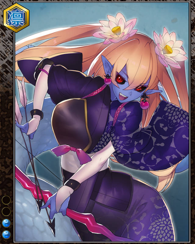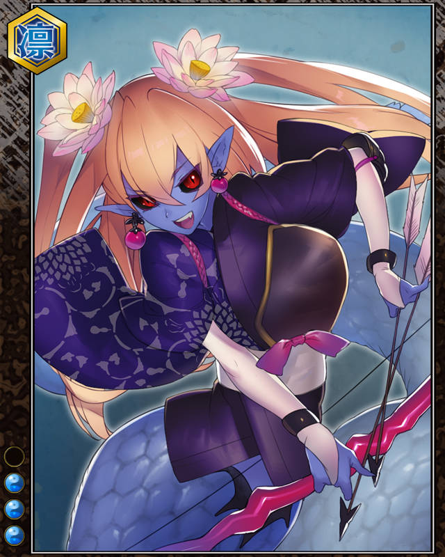 | コメント | 「ギィリギィリと締め付けたげる!!」 イズモ国に住む蛇の妖怪。元は神であったが 人々に忘れ去られ、今の姿へと転じてしまった。 実は甘党で大福が特に好き。 | |||