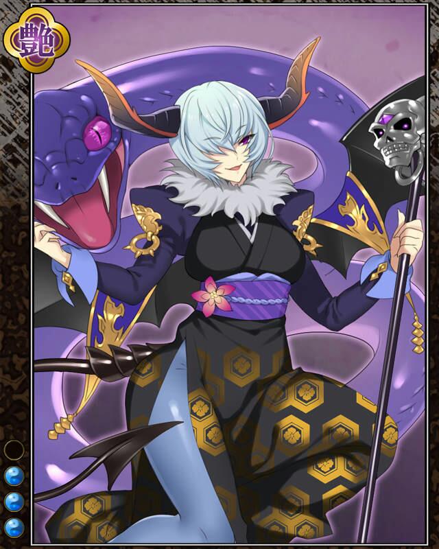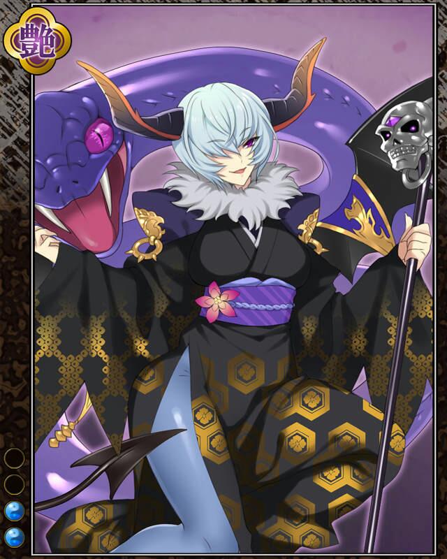 | コメント | 「猛者を影で支える蛇の智識……試してみる??」 元馬場信春家臣の軍配者。長篠の戦いで捕縛後、信長の黒母衣衆に与しては悪魔的な采配を振るう。うわばみで酒に酔って乱れる事はない。 | |||