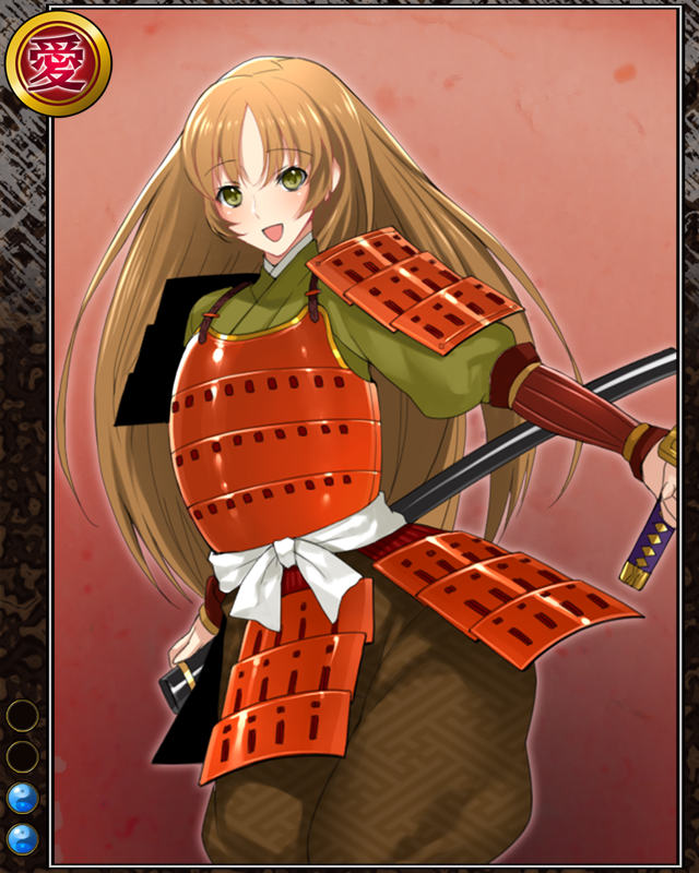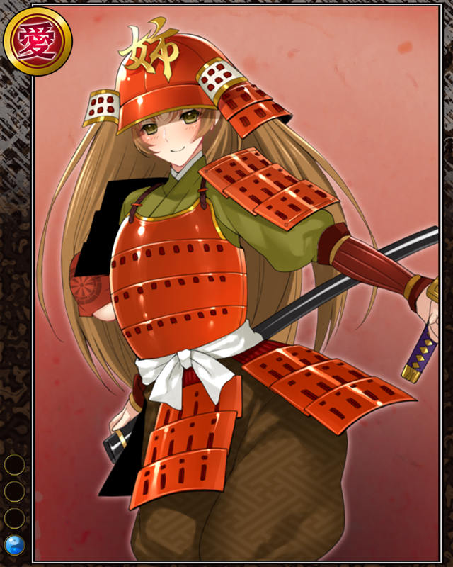 | コメント | 「さ、早く、戦を終わらせましょ」 元は飯尾定宗に仕えた赤母衣衆の一員で稲妻の如く切り込みに定評がある。戦場以外では8人の妹の面倒を見る優しく頼れる姉である。 | |||
