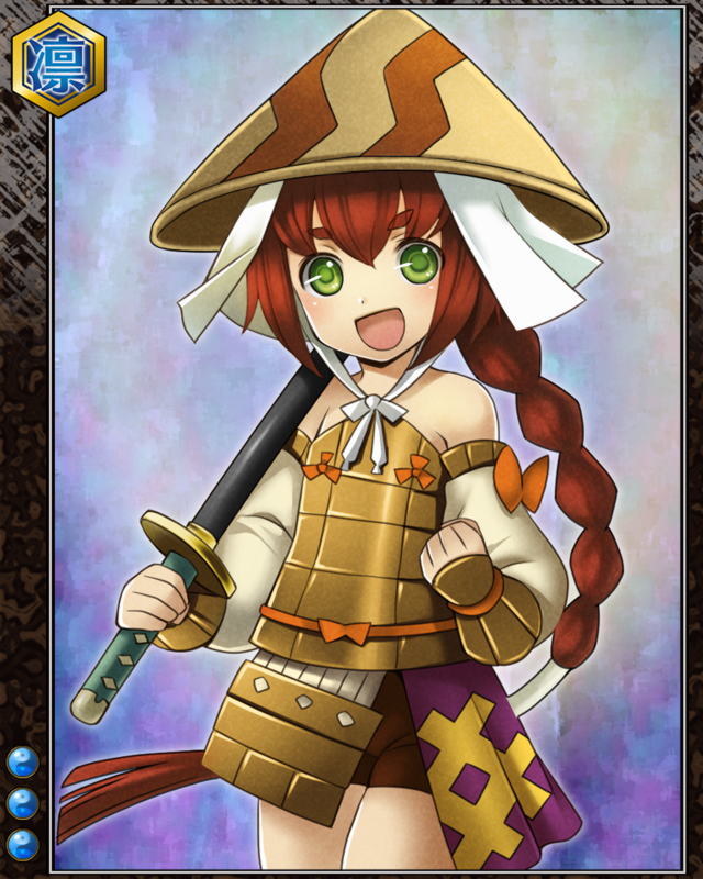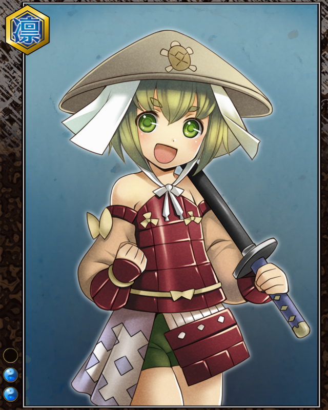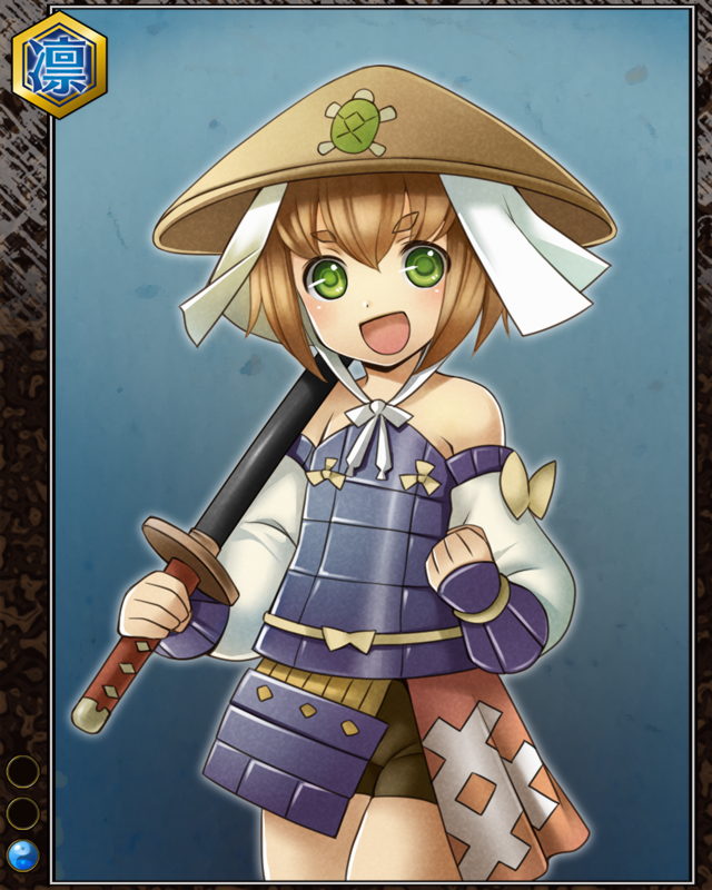 | コメント | 「よっし!手柄立てるべ!!」 タンバ国の農家の出。 幼い頃は近所のガキ大将だった。 明智光秀の部下として刀を振るう。 | |||