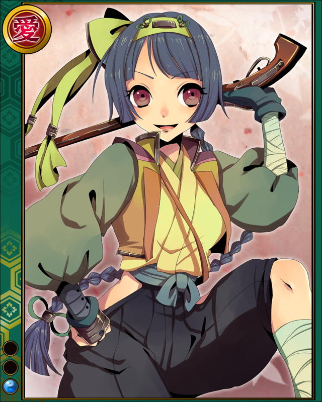 | コメント | 「わたしの想いは一撃必中っ!!逃がさないからっ!!」 雑賀衆頭目。 数百になる鉄砲隊を率いては信長軍と戦い続けた。 信長死後、秀吉と戦うも敗北の末、謀殺される。 | |||