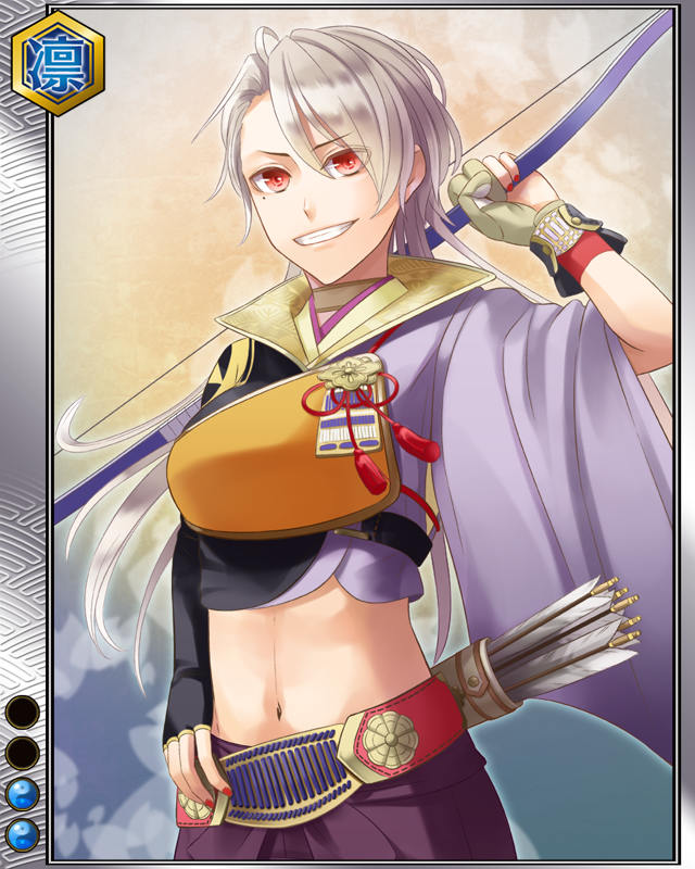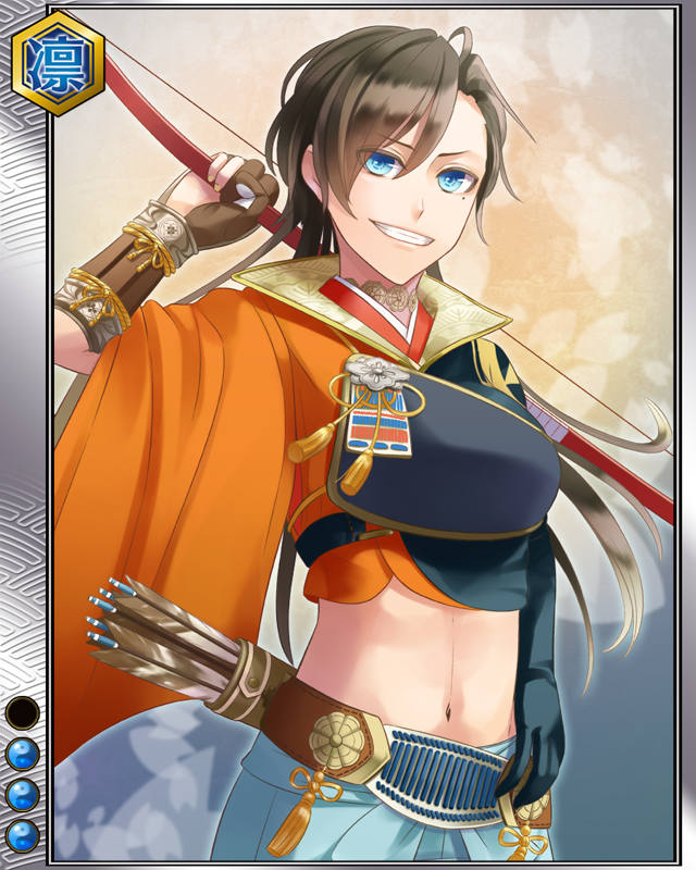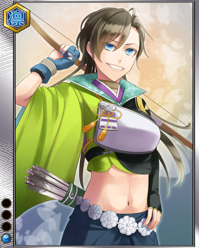 | コメント | 「ま、みてな……矢放つは槍の如くってな!!」 北条家随一の弓使い。オダワラ征伐では弓を手に奮戦するも火縄銃により戦死。北条家の宝とされた大学の弓は後に家康によってへし折られる。 |