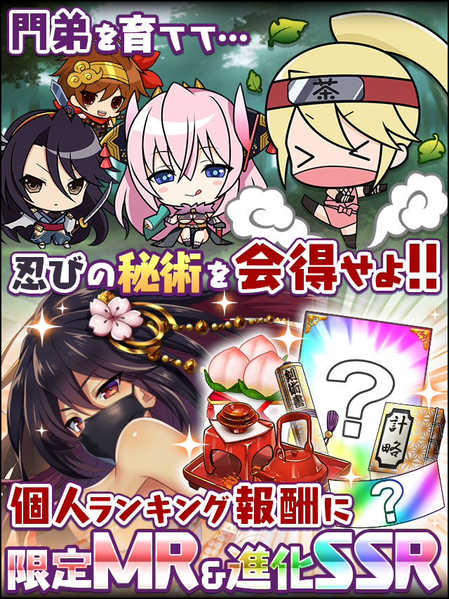 | 4週 | 残暑忍術競い | 【見習い】 | 体力 | 忍力 | 器用 | 回避 | 知識 | 忍気 | 200P 愛:30 剣術書【六】 | |
