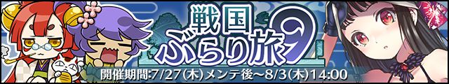 | 山城国 | 足利義政 | イベントガチャチケット(SR以上確定)×1 | 剣術書【参】x1 計略の秘伝書【参】x1 Gガチャの種【参】x1 烏天狗の伯耆坊 | 山城に海はないから、涼をとるなら庭園でね。池もあるから泳いでもいいよ⁇ | |