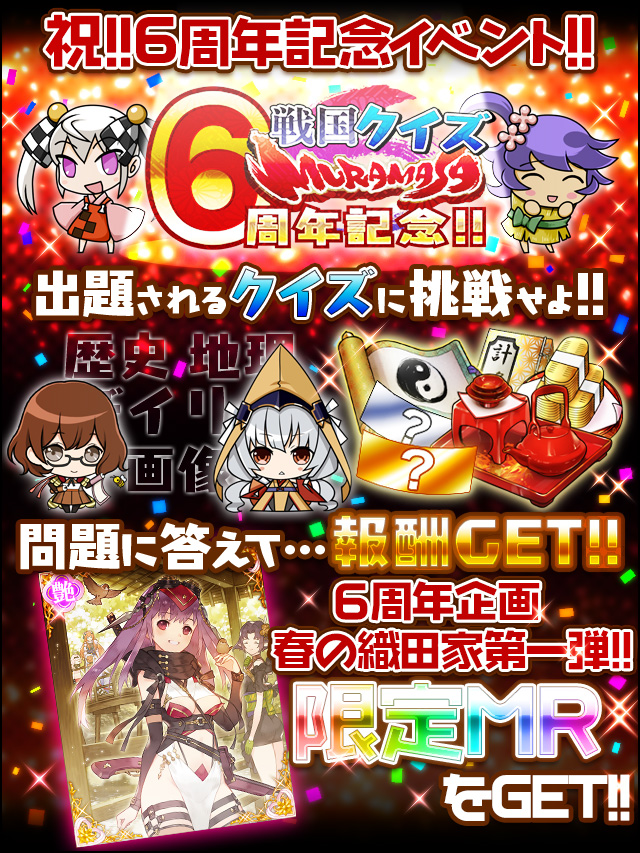 3月22日で戦国武将姫-MURAMASA-はぴったり6周年となるのじゃ!! 6周年を記念して、わし自ら【土日】に、この祭りに参加するかもしれんの!! この日を逃さないように注意するのじゃ!!