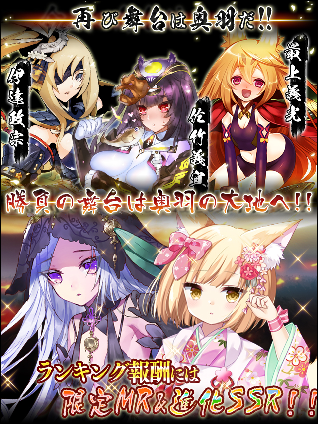 政宗「知っているか……奥羽の覇者は一人でよいということを」 義光「久々に登場なのです!!今回も激しくぶつかるのです!!」 義重「うちは常陸だけど……まあがんばっぺ!!」 みの吉「北国も雪が溶けて、皆さん動き出しましたよ!!熱戦になりますね、これは!!」