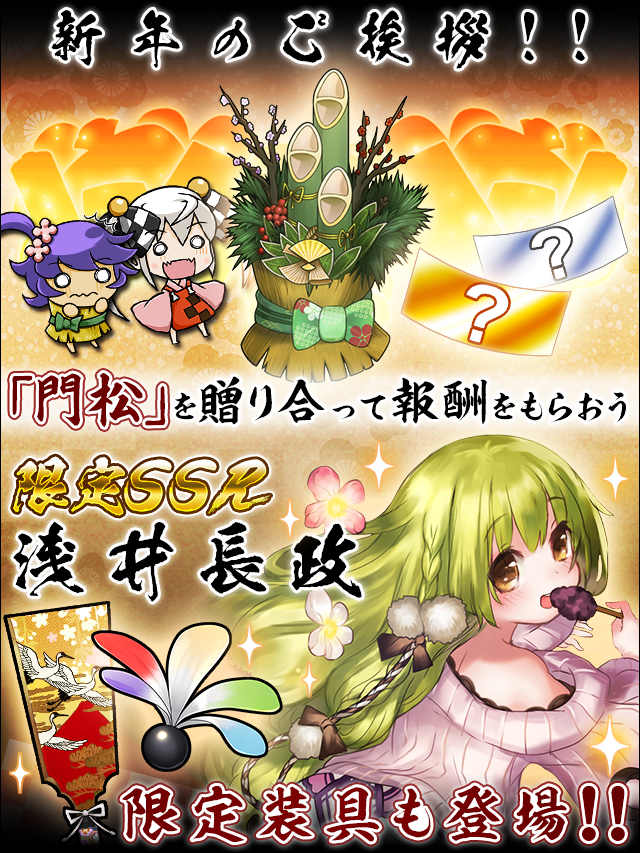 ・クエストで手に入れよう! クエストをプレイすると時々門松が手に入るぞ! クエストは最新クエストでなくてもOK!ただし行動兵力を多く消費するほど手に入りやすい! ・ガチャで手に入れよう! 真武将ガチャのオマケで門松をゲットしよう!