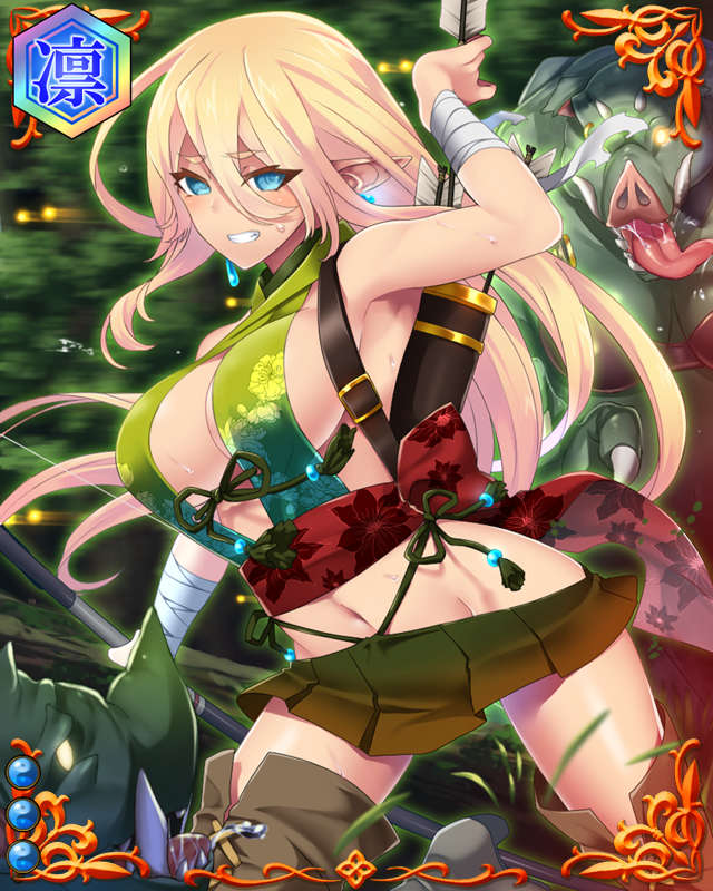 | コメント | 「矢を射り、敵を討つ……それをわたくしが得意とします」 織田信賢配下の弓名人。 ウキノで織田信長勢と対峙した際、鉄砲の名手橋本一巴との勝負となる。 勝負は互角、共に倒れる事となった。 |
