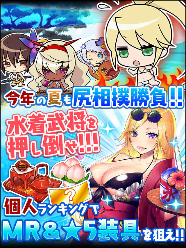 公式戦では、1人の武将と勝負を行うぞ! 公式戦はカレンダーの決まった日付で開催されており、参加するには、それぞれの参加資格を満たしている必要があるぞ。 公式戦に勝利すれば、水着ポイントと成功報酬、愛情度をゲットできるのじゃ!! 公式戦に負けてしまった場合でも、水着ポイントは半分貰えるから、積極的に参加していった方がいいぞ!! また、同じ桃尻ランクが出場資格となっている公式戦を、全て制覇すると「ランク制覇報酬」が貰えるぞ!!