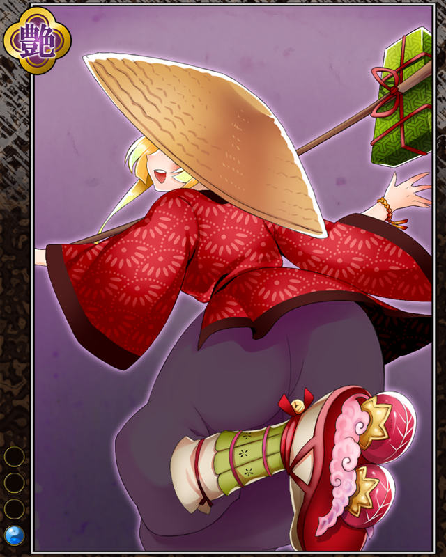 | コメント | 「どけどけどけどけぇいっ!!」 東海道を往来する飛脚で日本橋から三条大橋までを 2日で走る。その速さから紅蝙蝠の異名を持つが 本人からは不評。 | |||