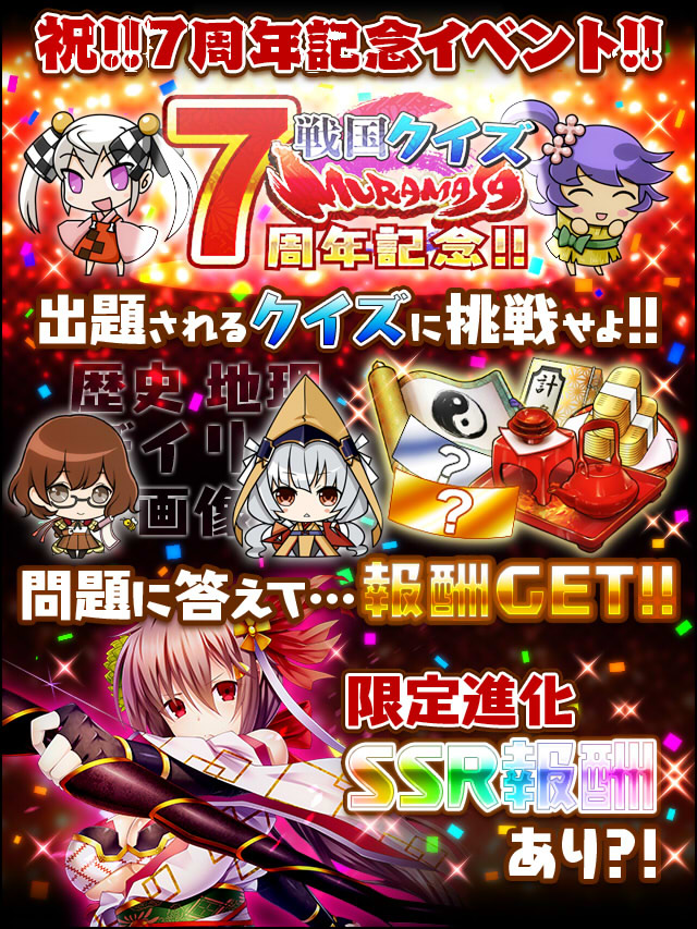 3月22日で戦国武将姫-MURAMASA-はぴったり7周年となるのじゃ!! 7周年を記念して、わし自ら3月22日に、この祭りに参加するかもしれんの!! この日を逃さないように注意するのじゃ!!