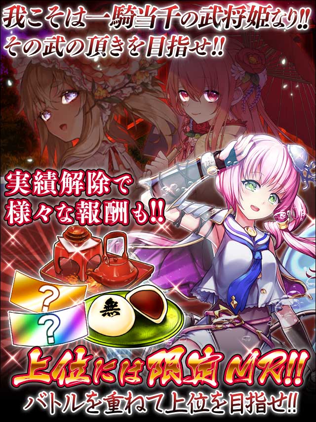 | 26 | 一騎当千 | バトルを合計1000回行った | イベントガチャチケット(SR以上確定) | 57 | ついに御大将 | 階級が-御大将-になる | 無双まんじゅう |