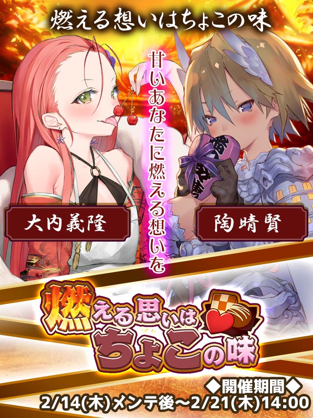 ガチャに登場する「[哀傷憂事]陶晴賢-甘露愛憎劇-」&「[憂節放蕩]大内義隆-菓子癒傷心-」に、イベント報酬の装具をセットすると絵柄が変化!