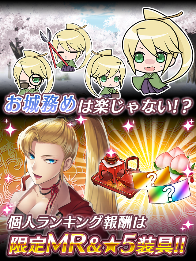今回は★5装具をランキング報酬とランク制覇報酬で獲得ができるようじゃぞ! さらに、★5装具「お昼の楽しみ」と「変化珠」を限定ガチャで排出するURR福島正則と戦国秀久に 装着すると、なんと絵柄が変化するようじゃ!!