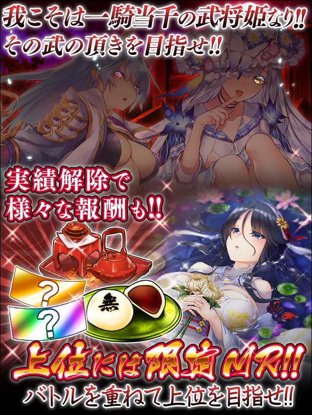 | 26 | 一騎当千 | バトルを合計1000回行った | -雅-コイン5枚 | 57 | ついに御大将 | 階級が-御大将-になる | 無双まんじゅう |