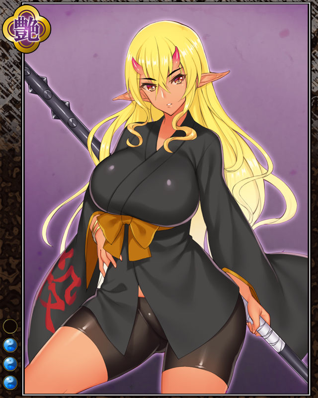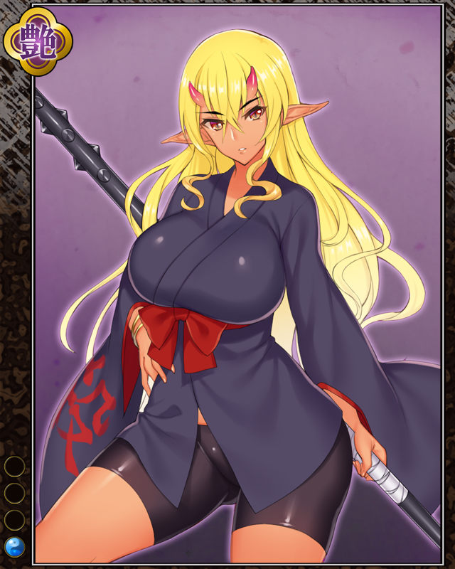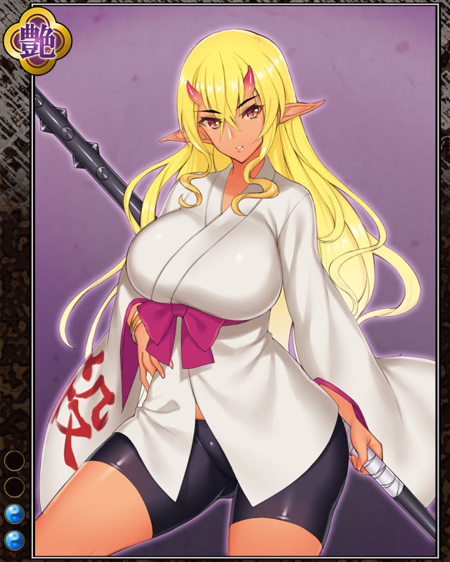 | コメント | 「古より伝わりし、硬き金の妙術ぞ!!」 藤原千方に使えていた四鬼の二、金鬼の名を受け継ぐ鬼の少女。 武具がつうじぬ鉄の如き堅牢な体を持つというが、髪の色くらいしか変化しない。 |
