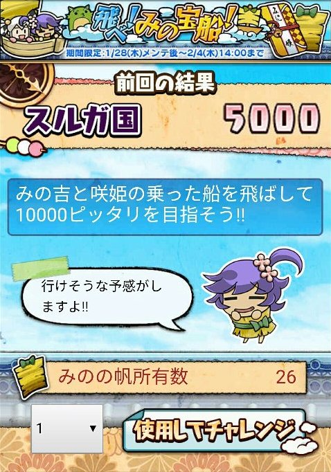 - みのの帆が手に入りにくいので基本みの吉の調子がいい時に少ない数で狙うしかない。